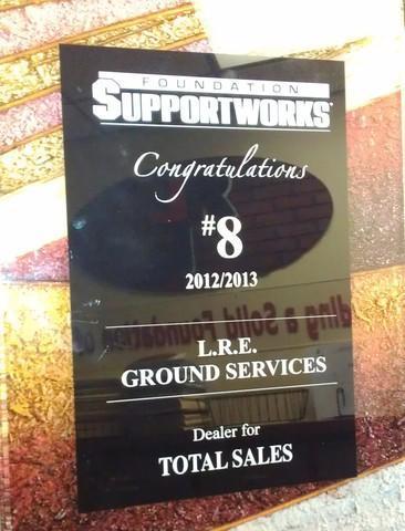 LRE Foundation Repair received several awards at the Annual Basement Systems/Foundation Supportworks Convention in Connecticut last weekend. LRE ranked No. 8 overall out of over 100 dealers in the Foundation Supportworks national network for products installed from 2012-13.