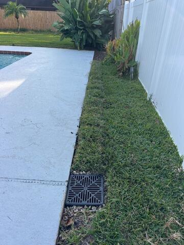 Our crew removed sections of the yard around the pool deck to install the catch basins, relief drain, and underground piping. Once everything was placed and connected, the team replaced the previously removed sod, leaving the new subsurface system neatly concealed with a clean, seamless appearance.