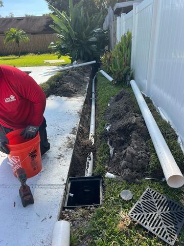 After inspecting the property’s layout, our specialist designed a plan to install catch basins throughout the yard that would collect and redirect rainwater through an underground drainage pipe and out a relief drain away from the pool deck. Connor reviewed the proposal and gave our team the green light to begin the work.
